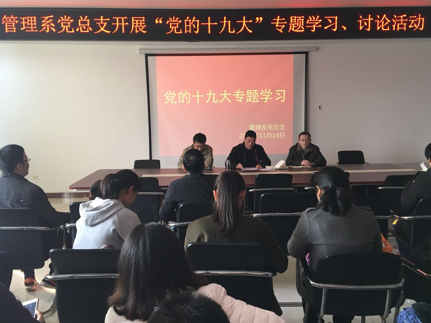 为了深入学习和领会党的十九大精神,11月14日下午,管理系党总支先在系党员活动室召开了 “党的十九大”专题学习、讨论活动。系党总支书记罗朝峰、副书记邹新忠领学了会议精神。
