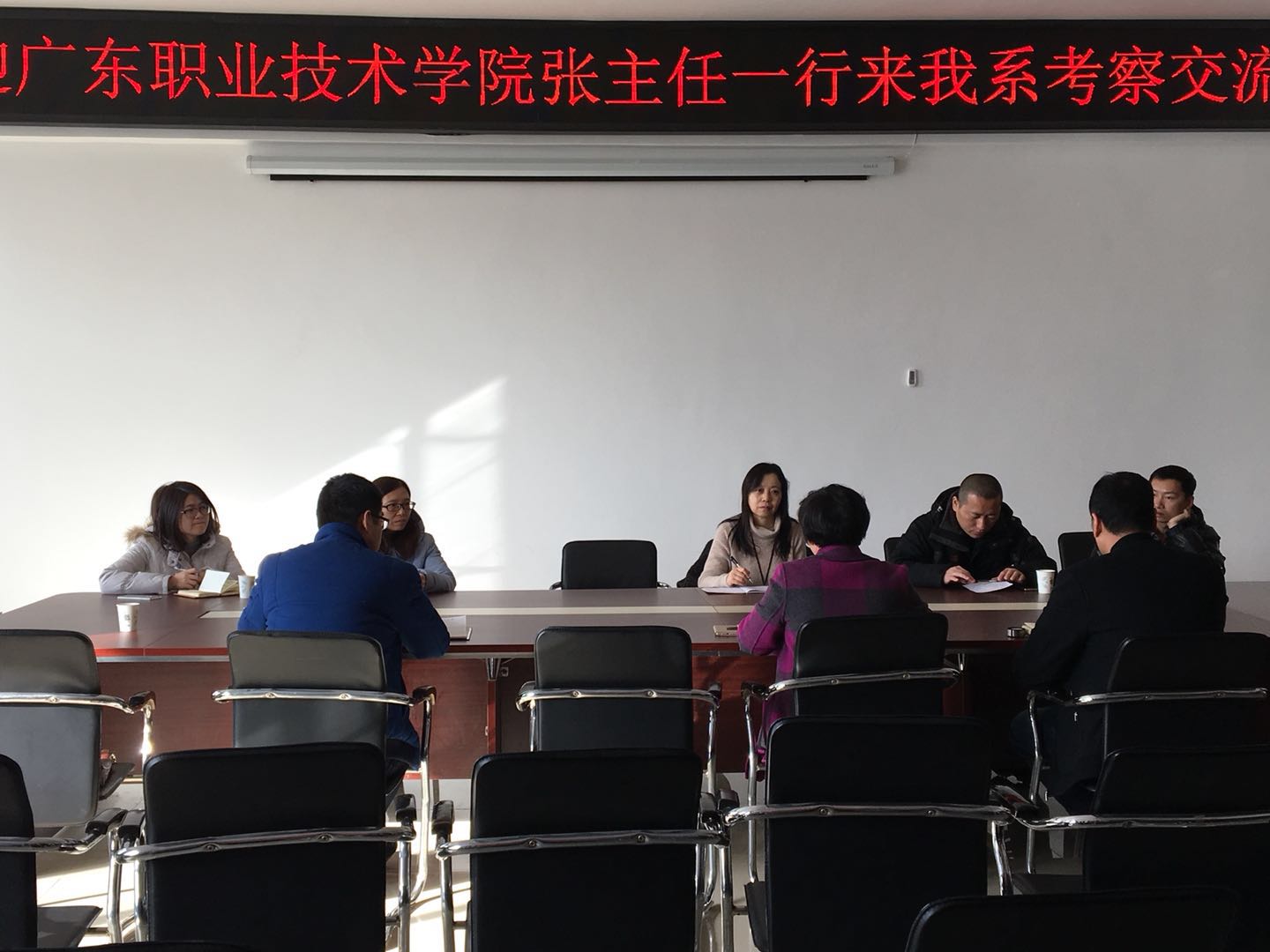 系主任周爱荣致欢迎辞,并从专业“2+1”教学模式入手,介绍了我系在学生职业精神培养、实践教学、跟岗实习、顶岗实习等方面取得的成绩和经验;并重点介绍了我系的科技创新创业工作,通过比赛、创业园建设、课程改革、跨专业组建团队等措施加强学生创新创业能力的培养,并通过实训室内涵文化建设,营造实战氛围,加强学生的职业体验。党总支书记罗朝峰介绍了我系学生管理工作经验,如开展主题班会、举行行业专家讲座,在学生管理中体现出专业特色。广东职业技术学院经济管理系主任张涛高度评价了我校及我系在示范建设、国家级教学改革试点专业、省级示范名牌专业等方面的建设成就,并对我系的热情接待和坦诚交流表示衷心感谢。双方深入探讨了工商管理、市场营销专业学生培养情况以及未来的发展建设思路。