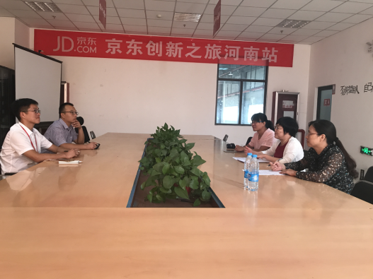 周主任一行4人先来到京东集团郑州基地与京东集团郑州基地人事部经理张瑜飞进行座谈。周主任介绍了我系基本情况、学生层次结构和管理类专业建设发展情况。张经理在了解了我系的办学情况和专业设置后,希望能与我系开展深度合作,双方在物流管理专业基本确定了订单培养意向,并就企业人才需求、人才培养模式、共建创业基地、毕业生就业问题进行了深入探讨。会后,张经理陪同我系教师参观了京东集团郑州基地,展示了学生以后的实习就业环境。