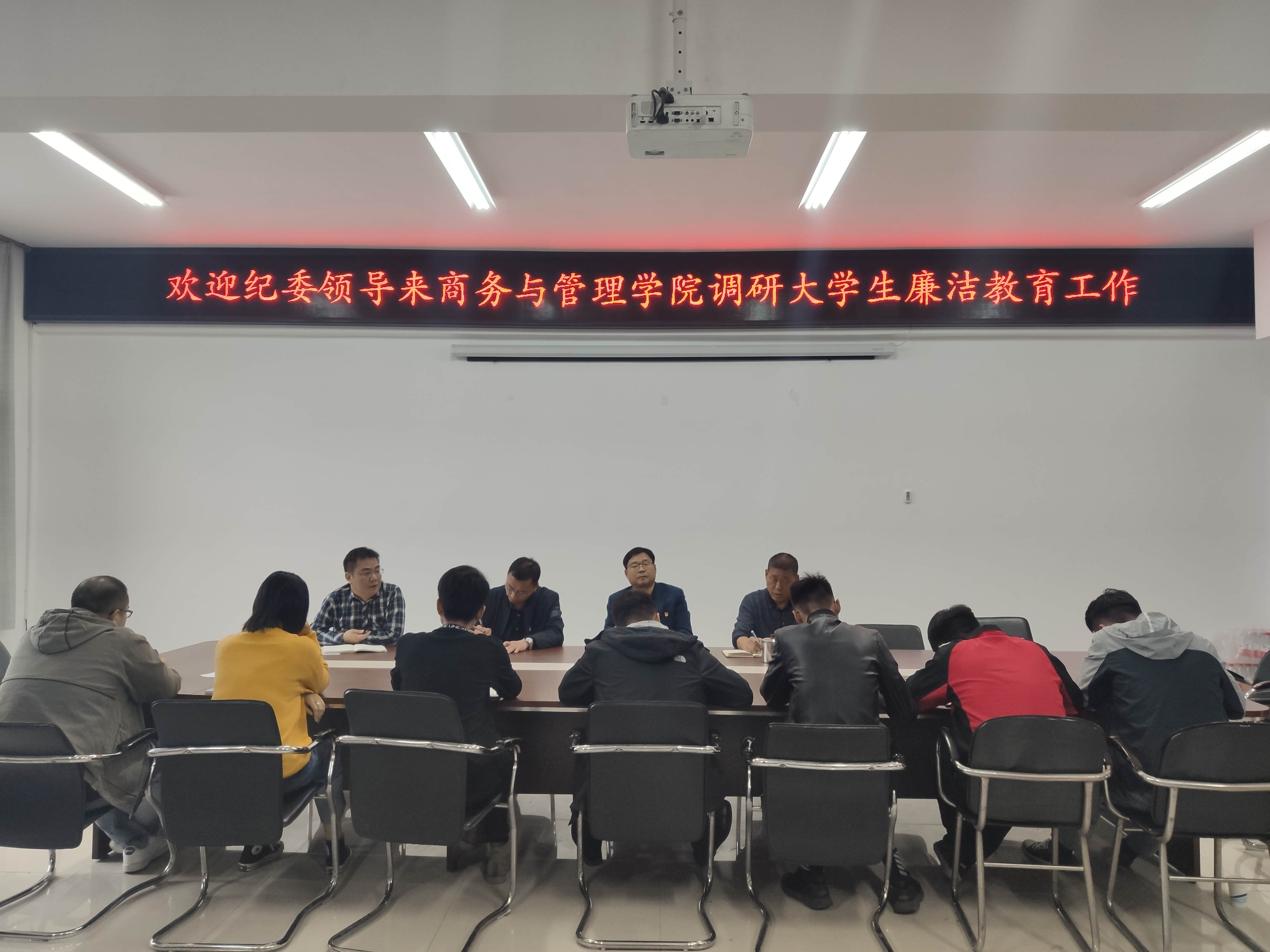 11月1日下午,学校纪委副书记王忠伟、办公室副主任李良玉一行到商务与管理学院调研大学生廉洁教育工作,学院党总支书记樊建科、副书记邹新忠、纪检员张伟和师生代表参加,会议由樊建科书记主持。