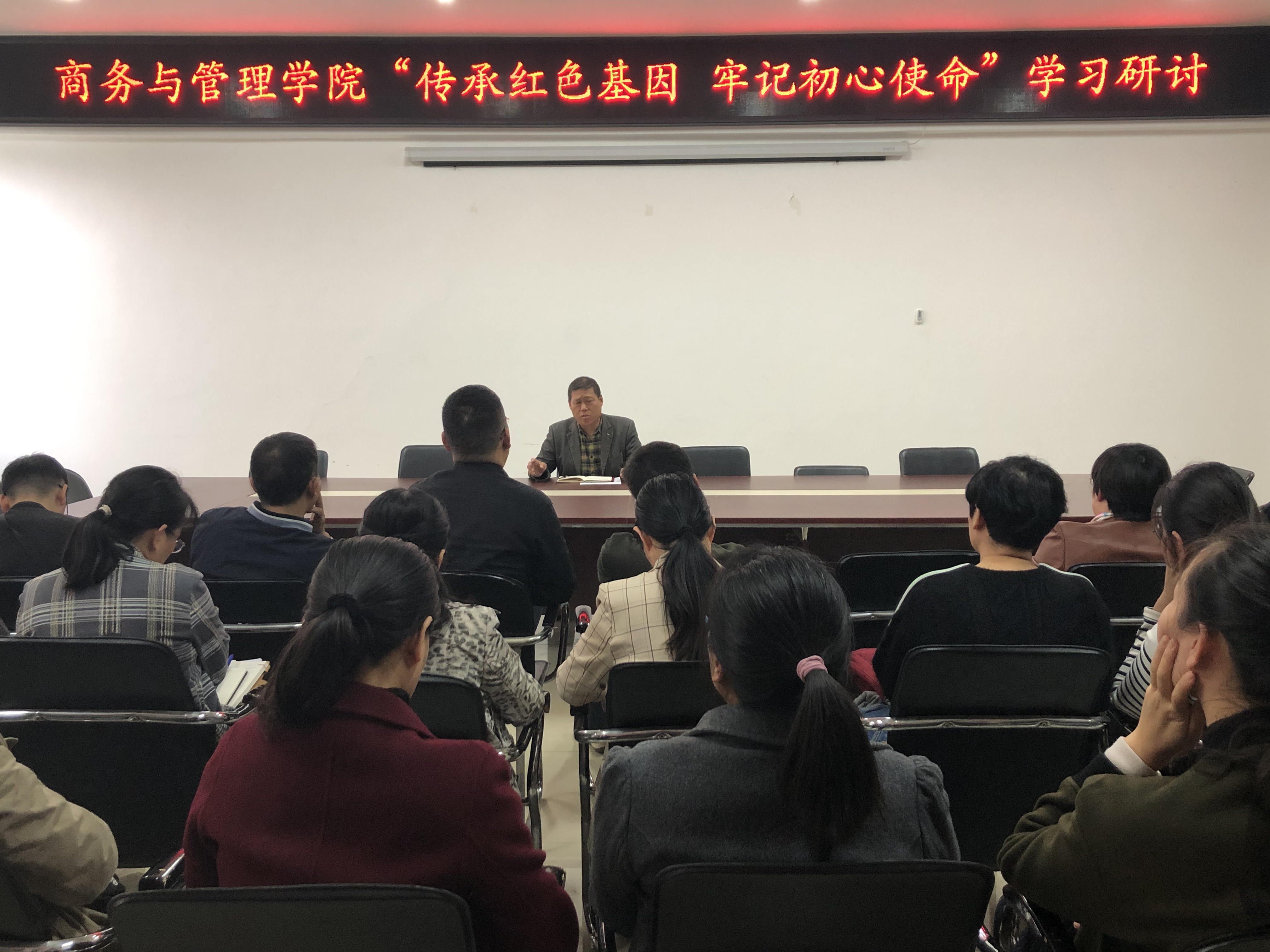 根据“不忘初心、牢记使命”主题教育工作要求,10月15日下午,商务与管理学院在党员活动室开展了“传承红色基因、牢记使命初心”为主题的学习研讨活动。