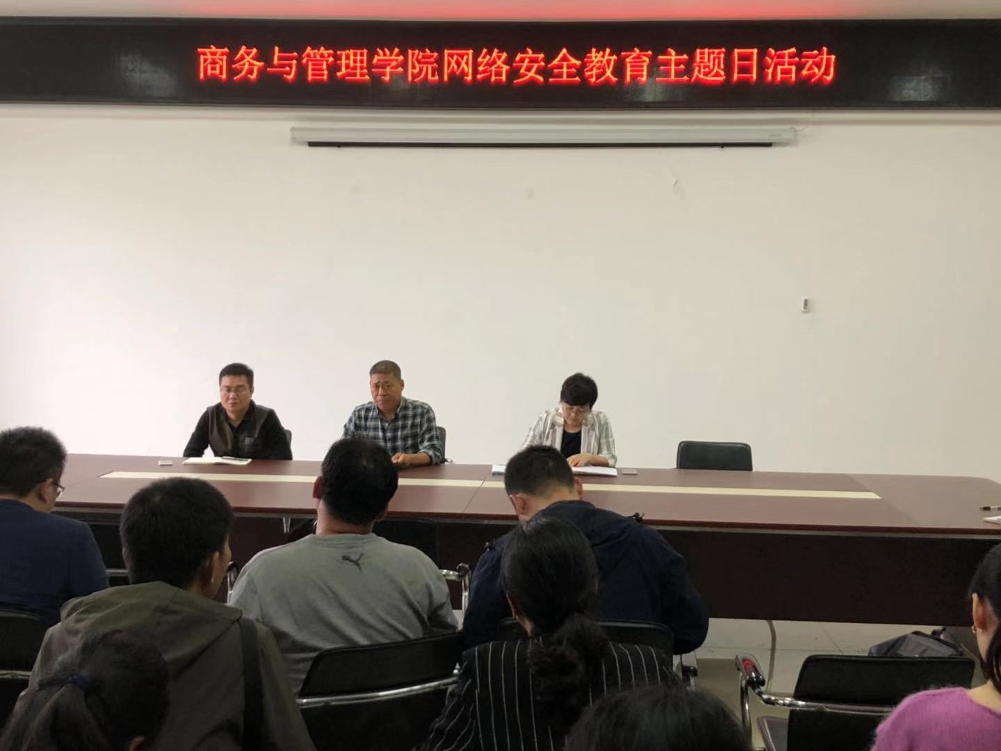 为了深入贯彻落实习近平总书记关于维护重点领域国家安全暨维护网络安全的重要思想,加强校园网络安全教育,2019年9月17日下午15:00,商务与管理学院网络安全教育主题日活动在院党员活动室如期举行。我校商务与管理学院党总支书记樊建科、院长周爱荣、党总支副书记邹新忠等院领导,以及各教研室教师、全体辅导员、教辅工作人员等相关同志出席活动。