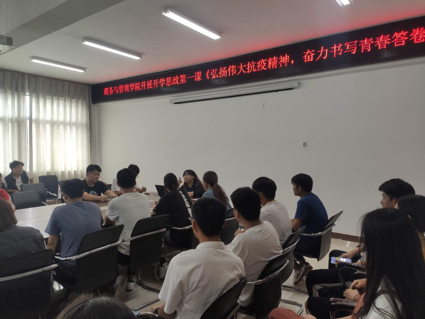 9月14日中午,商务与管理学院分团委书记牛钰在SY5420活动是,为学生分会、2019级班级团学干部共40余人开展了以“弘扬伟大抗疫精神,奋力书写青春答卷”为主题的“开学第一课”活动。