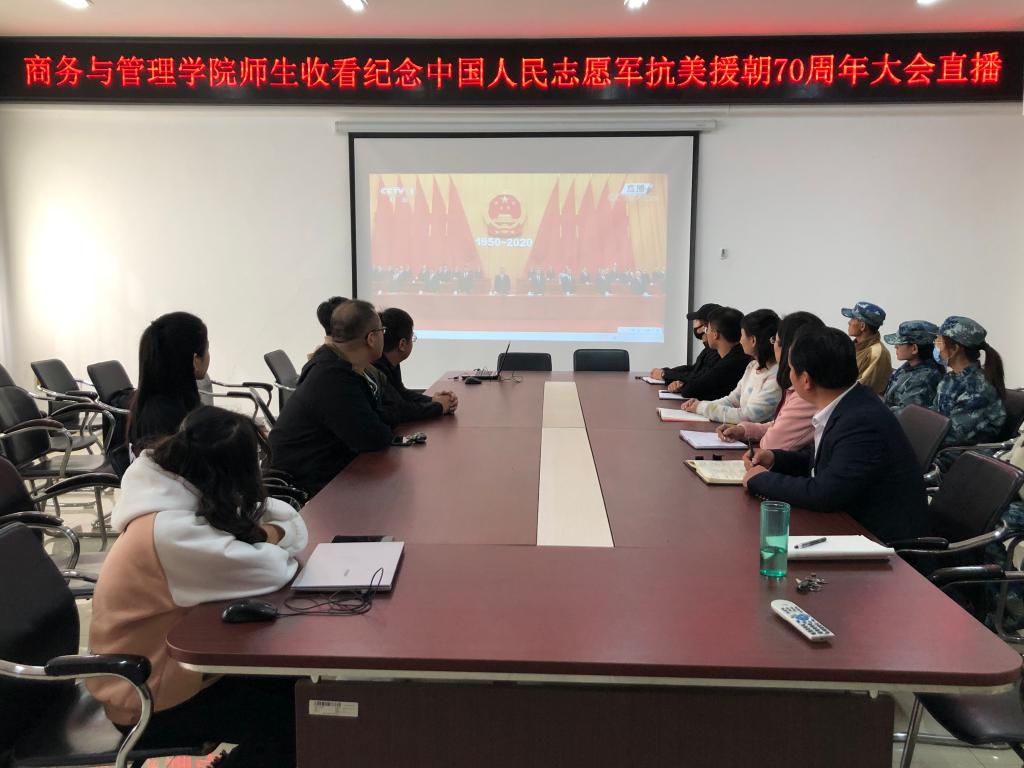 10月23日上午,根据学校统一安排部署,商务与管理学院组织行政坐班老师、学生代表在学院SY5420党员会议室观看了纪念中国人民志愿军抗美援朝出国作战70周年大会直播。