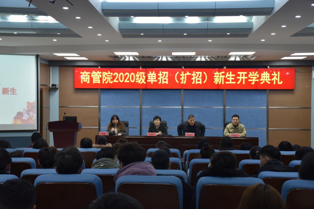 2020年12月6日,商务与管理学院在三号实训楼报告厅隆重举行2020级单招(扩招)新生开学典礼。商务与管理学院党总支书记樊建科、院长周爱荣、党总支副书记邹新忠、行政办公室主任尹友、教研室主任、辅导员和105名新生参加仪式,会议由分团委书记牛钰主持。