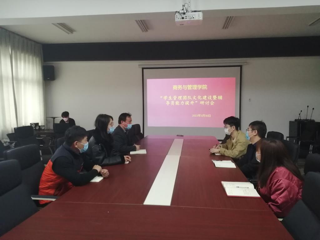 3月30日下午,商务与管理学院全体学工人员,在SY5420召开“学生管理团队文化建设暨辅导员能力提升”专项研讨会。会议由学院党总支副书记邹新忠主持。