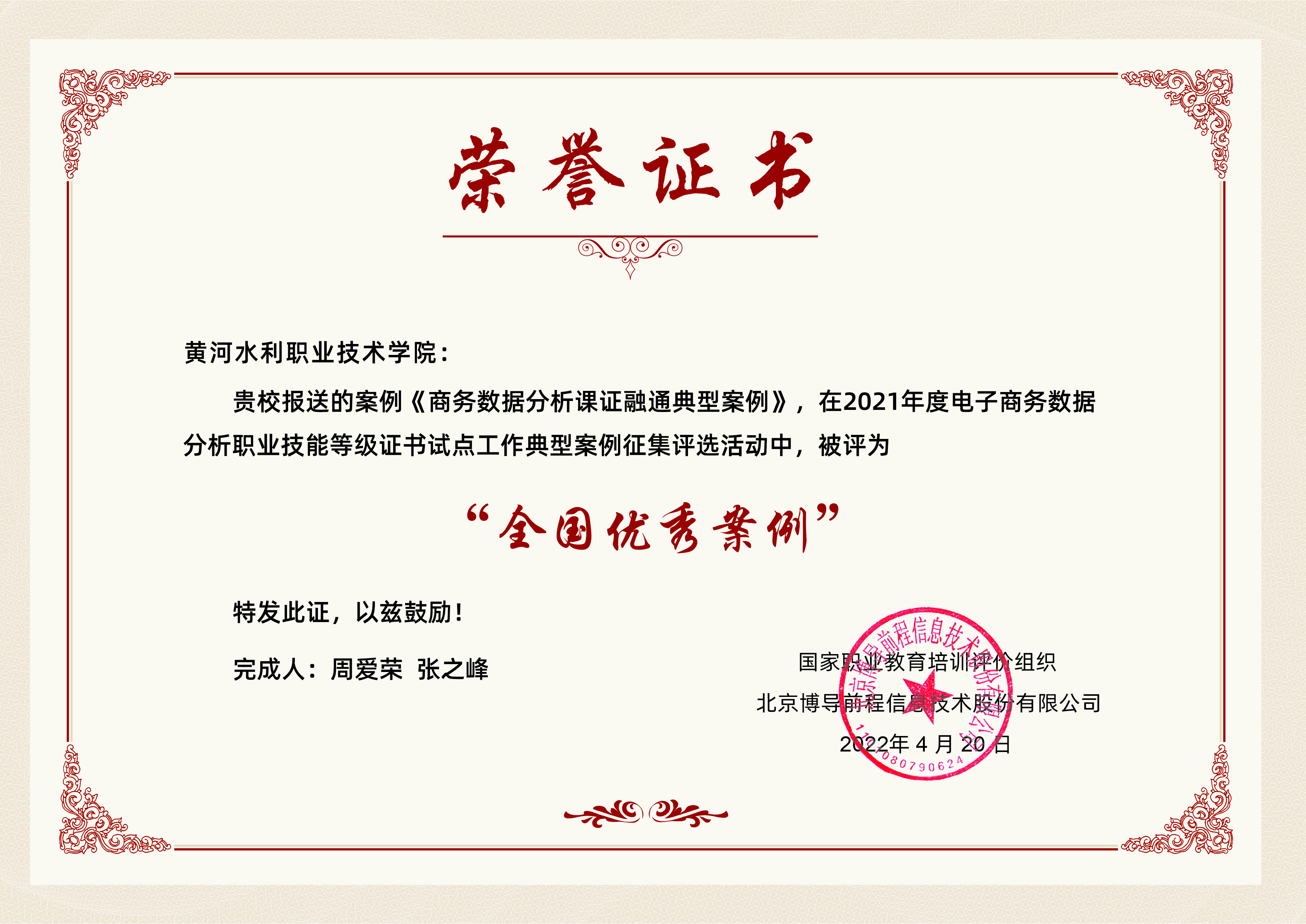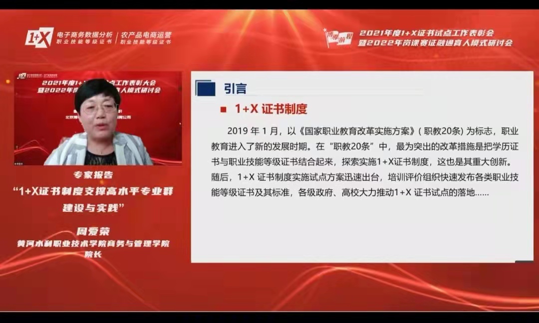 4月20日,由北京博导前程信息技术股份有限公司主办的2021年度电子商务数据分析1+X证书试点工作表彰会暨2022年“岗课赛证”融通育人模式研讨会在线上召开。本次会议对2021年度1+X电子商务数据分析和农产品电商运营职业技能等级证书试点院校及征集案例进行表彰。我校被评为2021年度“电子商务数据分析1+X证书卓越试点院校”,教学案例评为“全国优秀案例”,我校周爱荣老师获“突出贡献者”荣誉称号,张歌凌、张之峰老师获“优秀指导教师”荣誉称号。在会上,我校商务与管理学院周爱荣院长以《电商专业群1+X证书制度实施的“两全”“六融入”》为题,对我校探索1+x证书制度支撑高水平专业群建设与实践作专题报告。