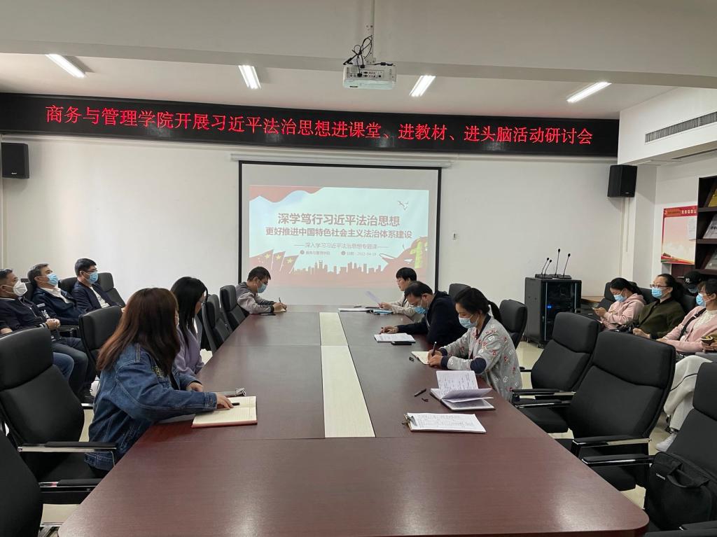 为深入学习贯彻习近平新时代中国特色社会主义思想,落实习近平总书记关于教育的重要论述和习近平法治思想,做好学校法治教育宣传周活动,2022年4月19日下午,商务与管理学院在实训楼5420召开习近平法治思想进课堂、进教材、进头脑活动研讨会,院领导及全体教职工参会。