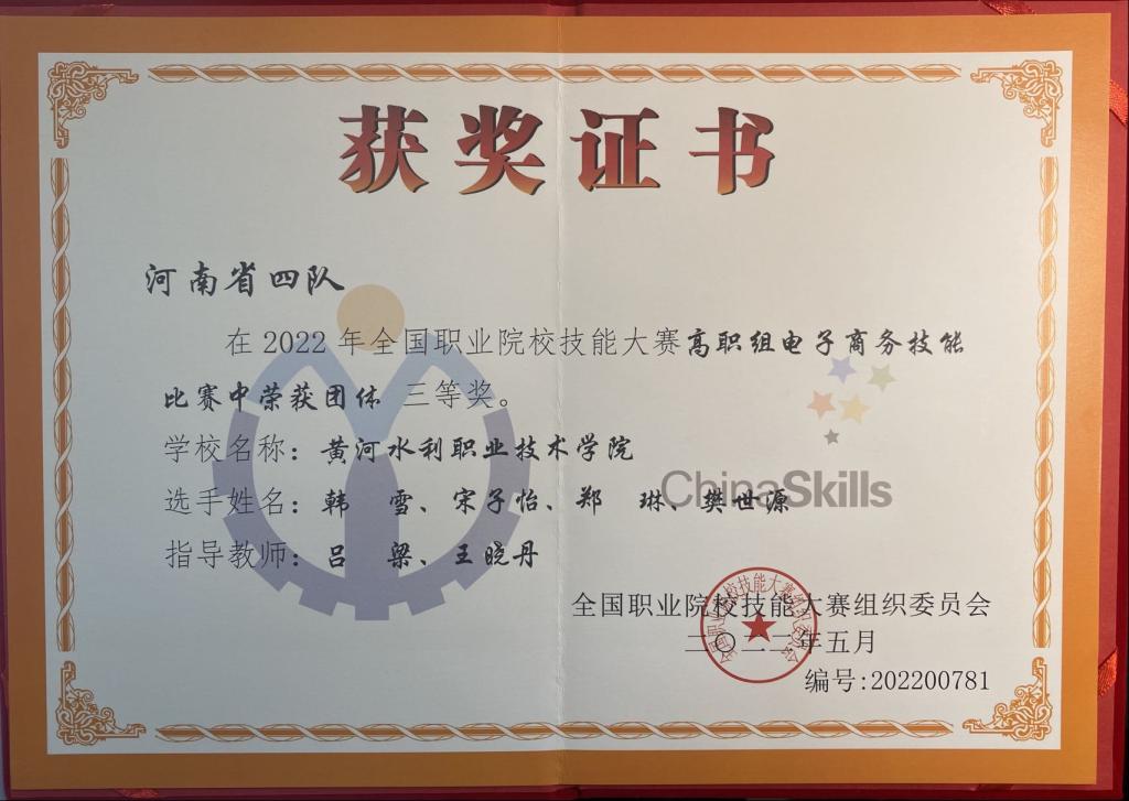 7月31日,2022年全国职业院校技能大赛(高职组)“电子商务技能”赛项在安徽商贸职业技术学院收官。经过激烈角逐,由我校商务与管理学院学生宋子怡、樊世源、郑琳、韩雪,指导教师吕梁、王晓丹组成的代表队,从全国65支代表队中胜出,荣获全国三等奖!