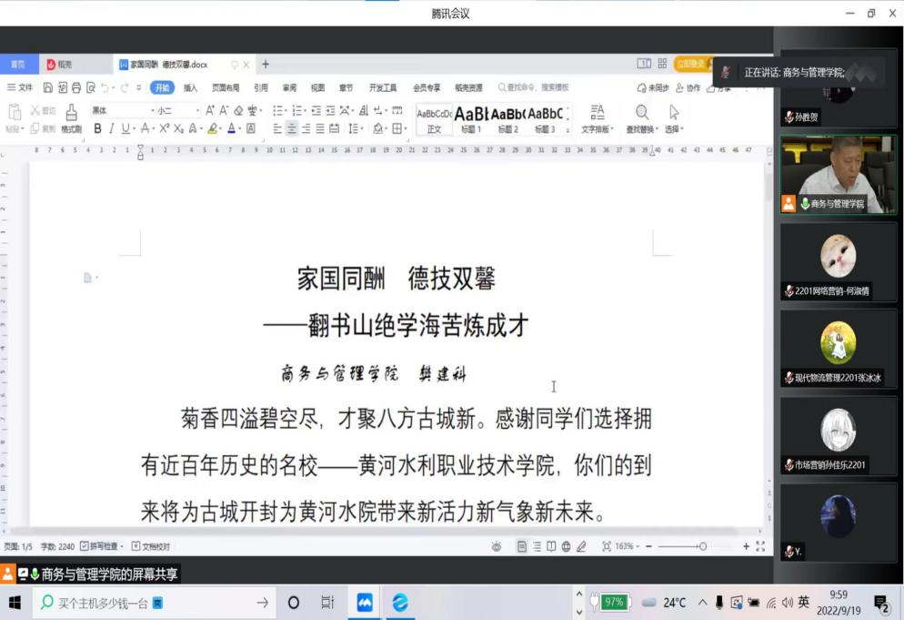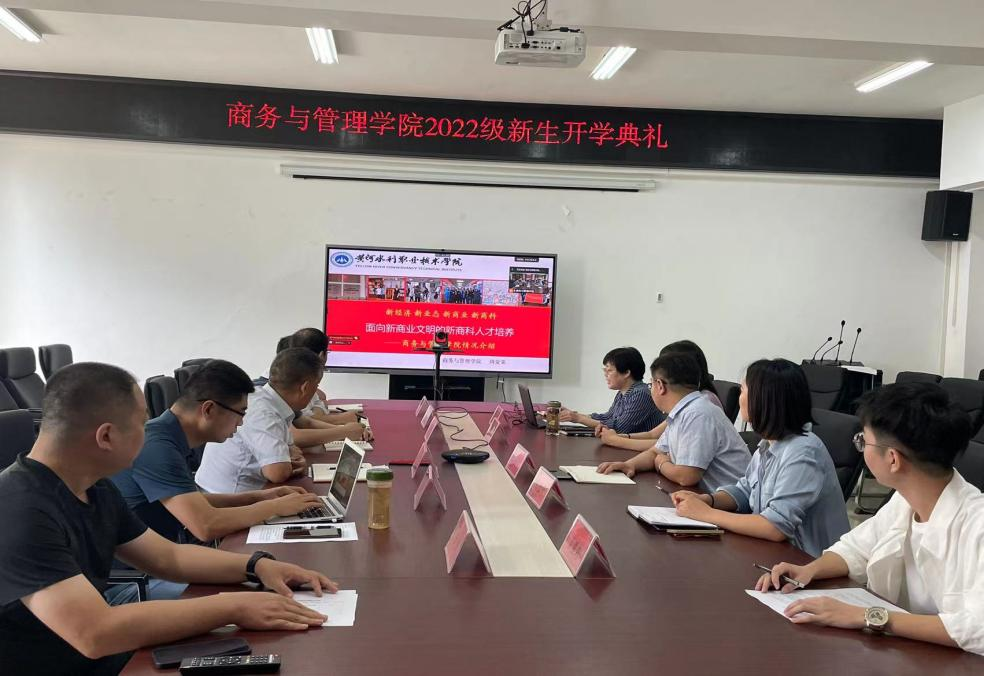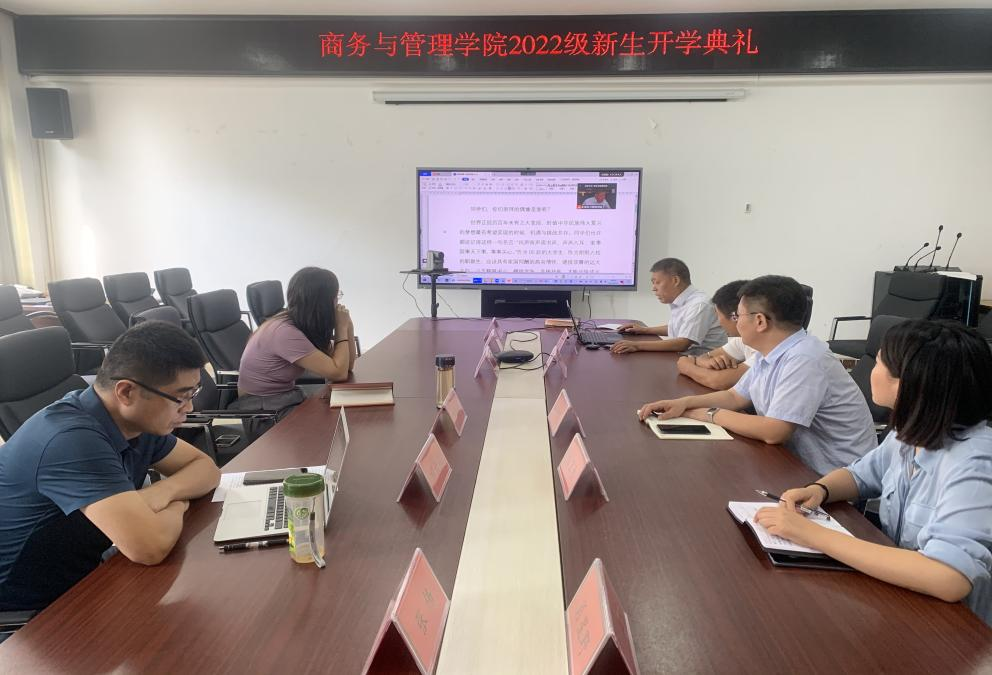 金秋时节,硕果累累,为帮助2022级新同学适应大学学习生活环境,结合入学教育和新冠肺炎疫情常态化防控形势及有关精神要求,9月14日上午,商务与管理学院以直播的方式召开了2022级新生线上开学典礼。学院领导班子、科级干部、教研室主任、骨干教师和全体辅导员在学院党员活动室参加了会议,会议由学院分团委代理书记肖星野主持。