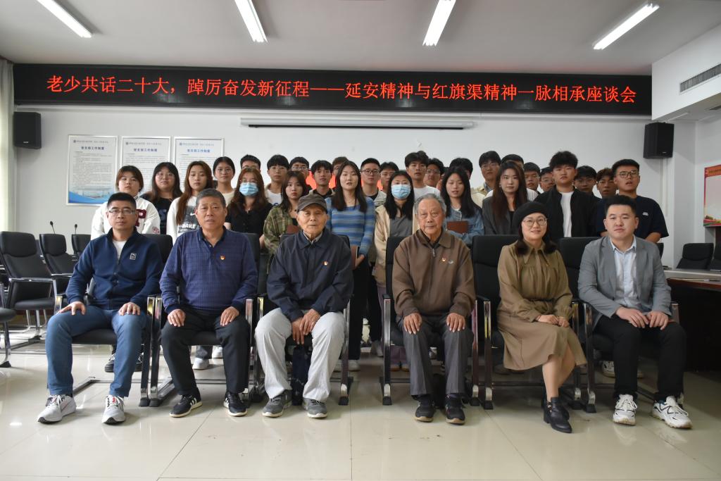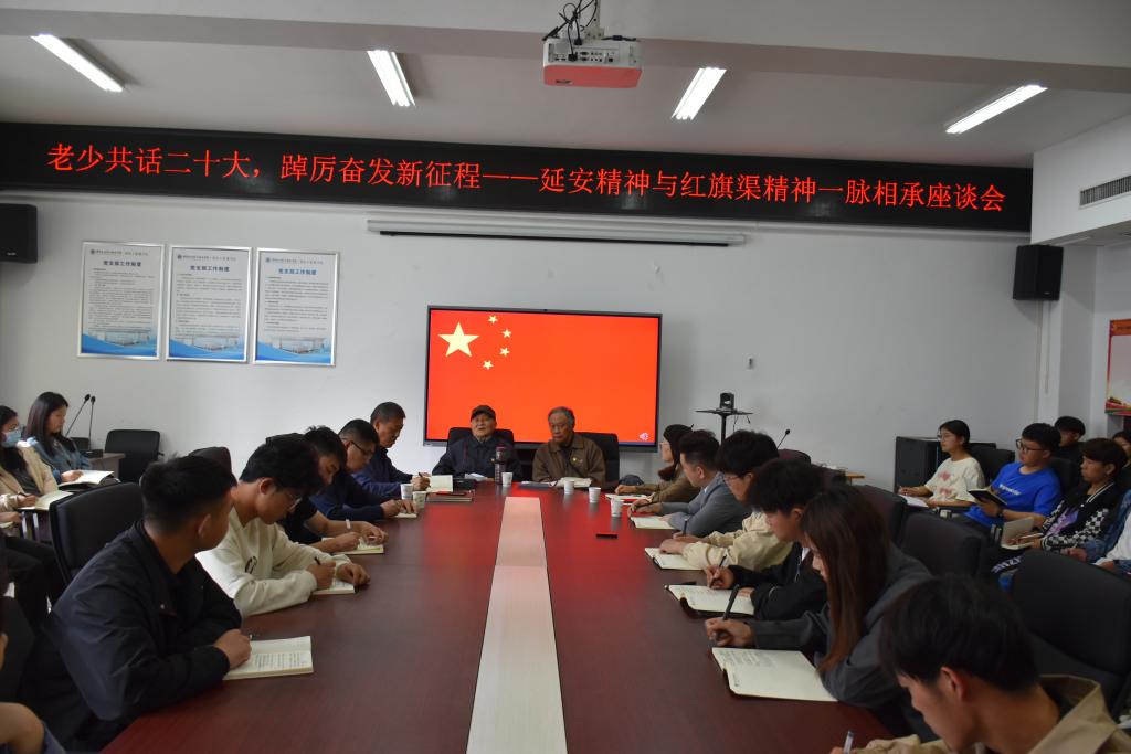 5月6日上午,学校老干部处退休老党员、老干部、老教师郑乃明、白济民在商务与管理学院党员活动中心与商管院师生代表共话党的二十大,以黄河水利职业技术学院发展为例,就习近平总书记关于延安精神与红旗渠精神是一脉相承的重要论述进行座谈,勉励教师和青年学生继承和弘扬延安精神和红旗渠精神,踔厉奋进新征程,将人生梦想融入中华民族伟大复兴的中国梦,不懈努力,勇攀高峰。参加座谈会的还有老干部处党总支书记李少春,商管院党总支书记樊建科、副书记邹新忠,学院“双带头人”程云翔,分团委负责人肖星野,骨干教师田丰,红旗渠精神传承人秦晨凯等。