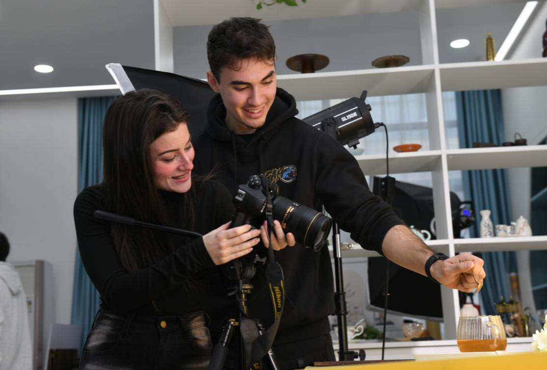 实践环节中,意大利师生深度探访学院电商生态全链条。在学院直播电商生产实践基地,他们不仅了解了拼多多、抖音等平台运营机制,更通过海澜之家服饰、海信电器等案例,直观感受中国品牌数字化转型路径。在直播体验区里,意大利学生化身“国际主播”,在镜头前用中意双语推介商品,引得现场掌声连连;而在电商专业实景课堂,从直播间搭建到短视频制作,从人像摄影到美工修图,访学团队全程参与创作,一件件融合中意文化元素的作品新鲜出炉。贝卢齐学院学生乔瓦尼(Giovanni)兴奋地说:“这里的一切都充满活力!”