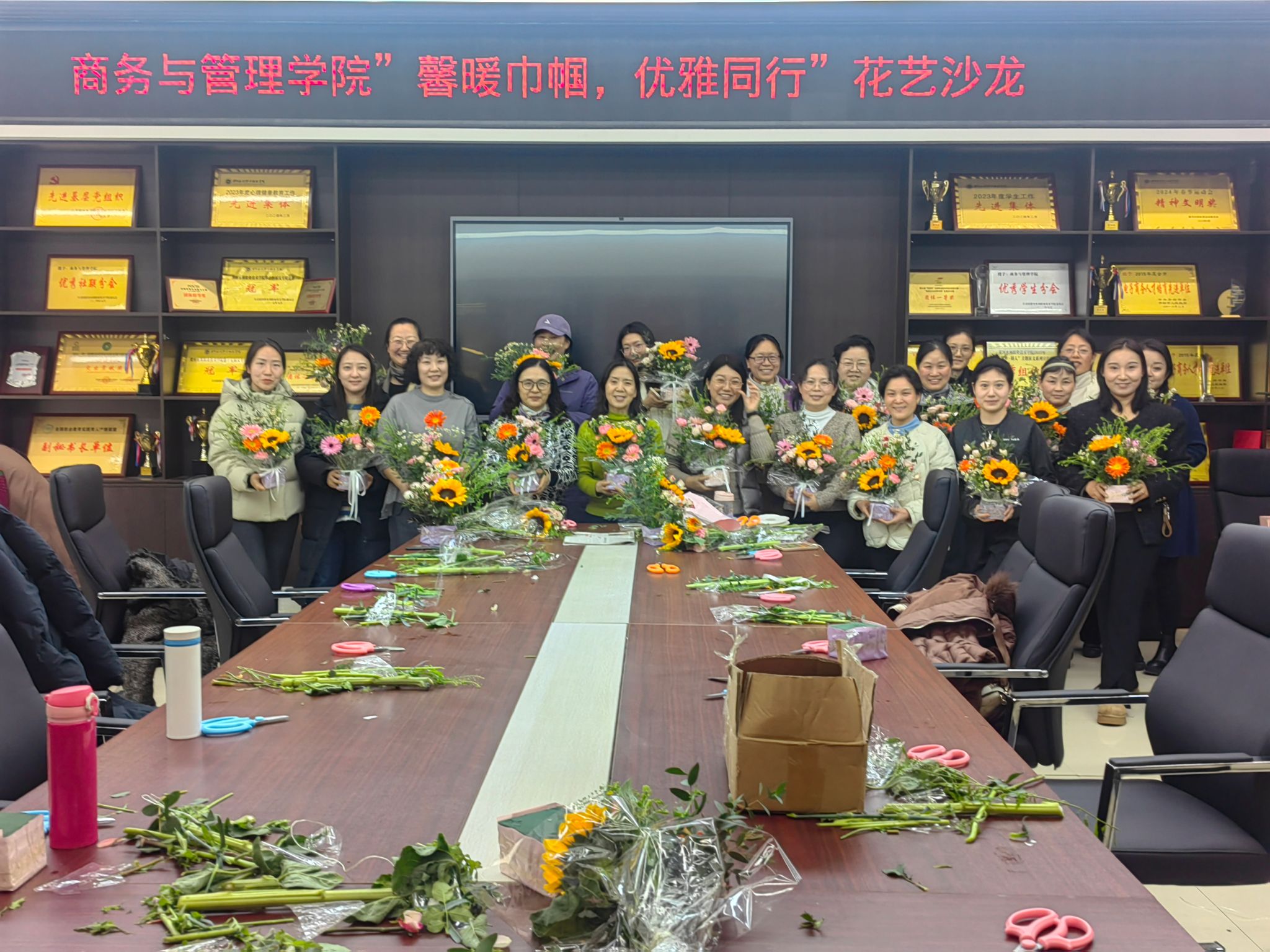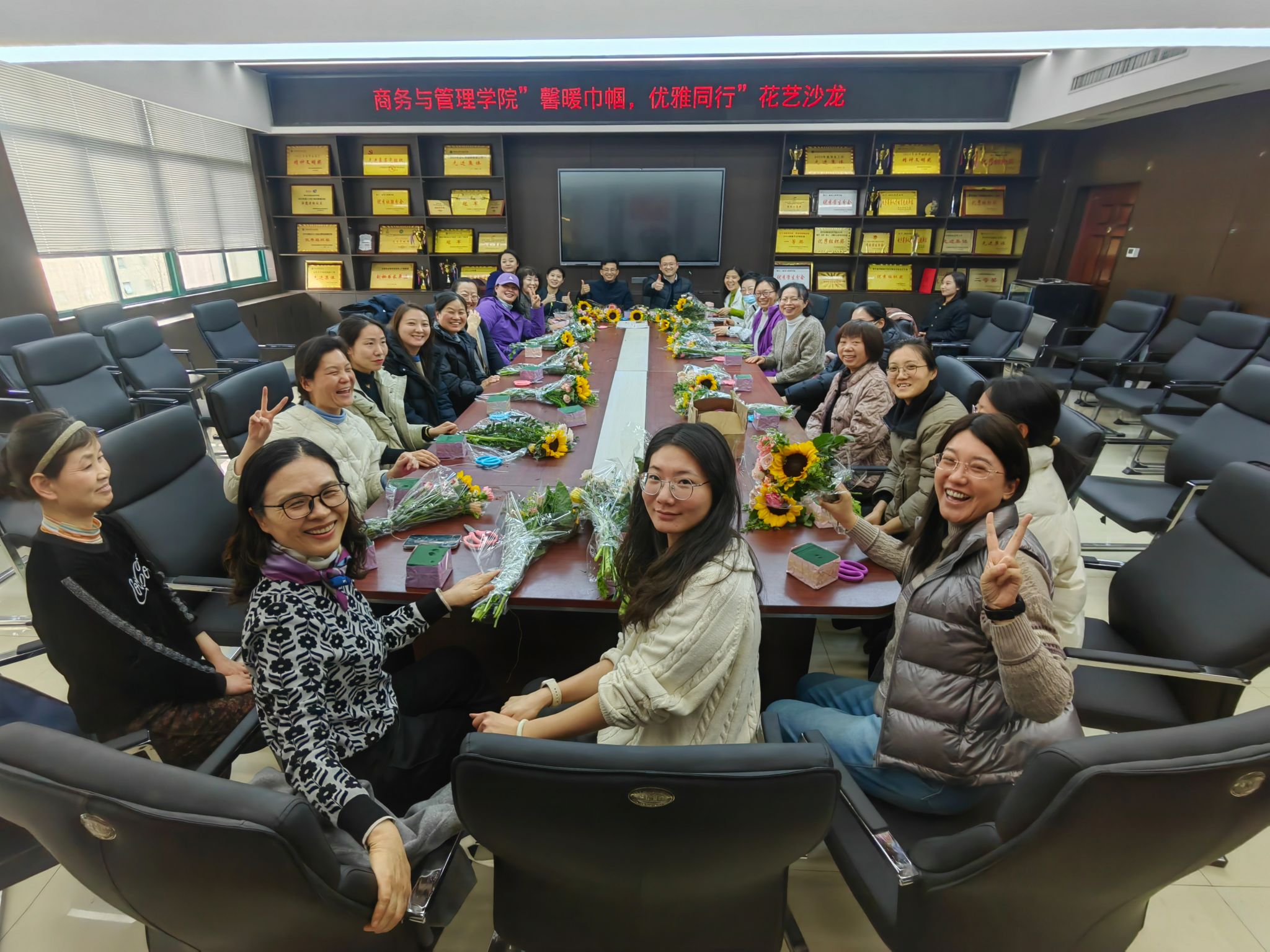为迎接第115国际劳动妇女节34日下午,商务与管理学院全体女同胞们在SY5420会议室举办了一场以“馨暖巾帼,优雅同行”为主题的花艺沙龙。学院党总支书记孙辉、院长吕梁等领导班子也出席了此次活动。