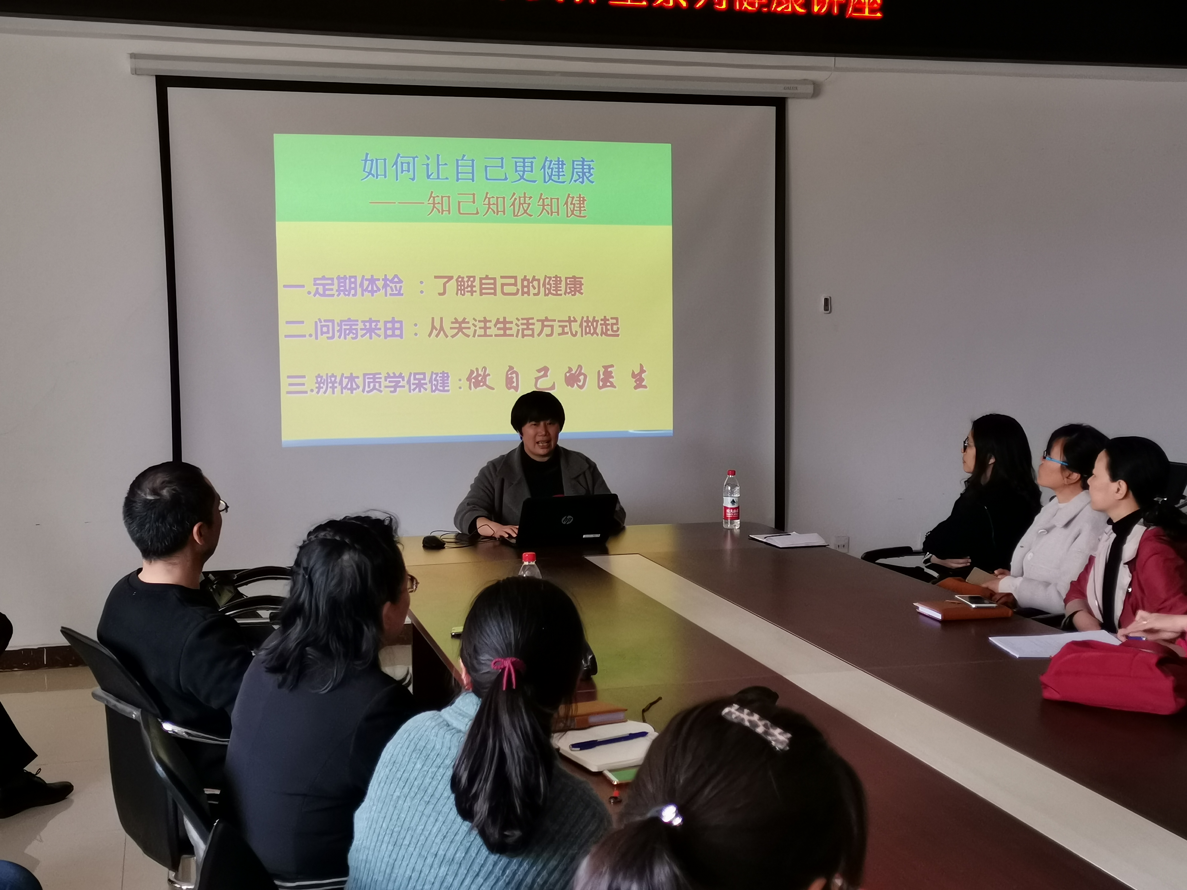 谢大夫以如何让自己更健康为主题,讲解:首先定期体检,了解自己的健康;其次问病来由,从关注生活方式做起;最后辨体质学保健,做自己的医生。讲座过后,谢大夫又不辞辛苦,现场为老师们把脉诊断,提出健康建议,受到老师们的一致好评。