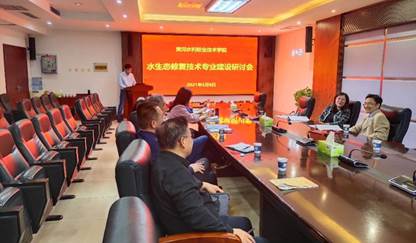 报告结束后,水利工程学院院长陶永霞在行政楼二楼会议室主持召开水生态修复技术专业建设研讨会。研讨会上,焦爱萍副校长介绍了我校近年发展历程、办学特色、发展成就以及“双高计划”建设情况,并向彭涛高工颁发水生态修复技术专业客座教授证书。随后,水利工程学院水生态修复专业带头人王宏涛博士介绍了我校水生态修复技术专业设置背景和发展历程,水生态修复技术专业教学团队与彭涛高工就水生态修复技术专业建设和人才培养方案制定进行了深入交流探讨,彭涛高工对水生态修复技术专业定位、培养目标、课程设置和专业发展提出了建设性意见和建议。陶永霞要求专业教学团队认真汲取彭涛高工的意见和建议,精准定位专业发展方向,明确专业培养目标,科学制定课程体系,持续完善教学内容,将水生态修复技术专业建成特色鲜明、国内领先的示范专业,为培养专业特色明显,契合需要的高素质技术技能人才做好顶层设计。