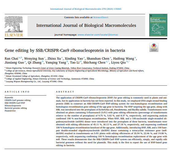 近日,国际著名期刊《International Journal of Biological Macromolecules》发表以黄河水利职业技术学院为第一完成单位,环境工程学院柴冉博士为第一作者的研究成果“Gene editing by SSB/CRISPR-Cas9 ribonucleoprotein in bacteria”。《International Journal of Biological Macromolecules》是化学类中科院一区top期刊,影响因子IF:7.7。