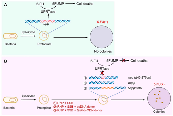 该研究采用SSB/CRISPR-Cas9 RNP非同源重组和同源重组基因编辑细菌的upp基因。将靶向upp基因的RNP和大肠杆菌的SSB一起转入大肠杆菌、假单胞菌和枯草芽孢杆菌原生质体,在含有5-FU的平板中长出的转化子均为非同源重组编辑转化子,基因编辑效率分别为9.75%、5.02% 和8.37%。将 RNP、SSB和同源臂长度为100 nt 的ssODN donor一起转入大肠杆菌、假单胞菌和枯草芽孢杆菌原生质体,在含有5-FU的平板中长出的转化子均为同源重组敲除upp转化子,基因编辑效率分别为45.11%、30.13%和27.18%。将 RNP、SSB和同源臂长度为100 bp 含有四环素抗性基因表达盒的双链DNA donor tetR-dsODN一起转入大肠杆菌、假单胞菌和枯草芽孢杆菌原生质体,在含有5-FU的平板中长出的转化子均为同源重组tetR替代upp的转化子,基因编辑效率分别为35.94%、22.46%和19.08%。结果表明,SSB/CRISPR-Cas9 RNP能够高效编辑细菌基因,简便、快捷、无需消除质粒。