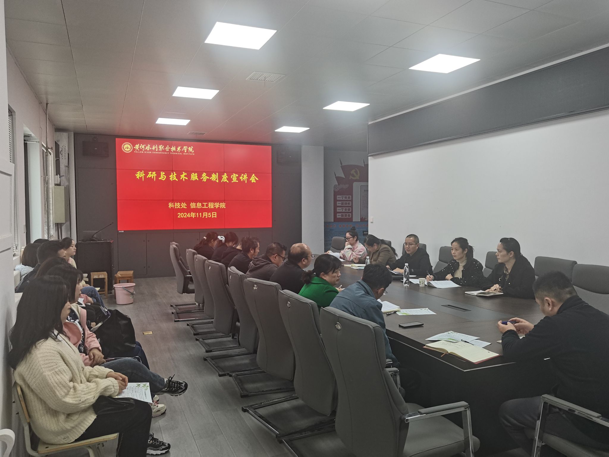 11月5日,科研与技术服务制度宣讲会在信息工程学院会议室召开。科技处副处长戴玉、聂大勇,信息工程学院领导班子、全体教师参加了会议。会议由信息工程学院副书记武琳琳主持。