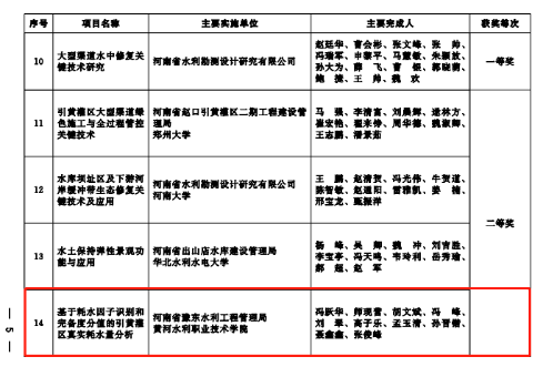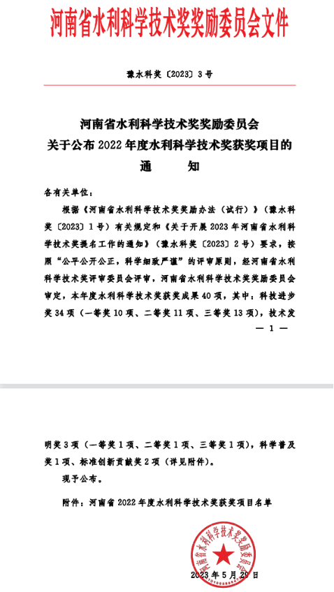 河南省水利科学技术奖评选是由河南省水利厅组织开展的水利科学技术创新成果申报工作,是贯彻落实我国新时期“十六字”治水方针和我省“四水同治”治水新理念,促进水利科技进步的重要举措,在鼓励水利科技工作者勇于创新方面起到积极的推动作用。此次我校两项成果喜获二等奖,展示了我校科研团队在科技创新、技术研发、推广应用等方面取得的成果,也将为我校“双高计划”建设、职业本科申报奠定良好的基础。