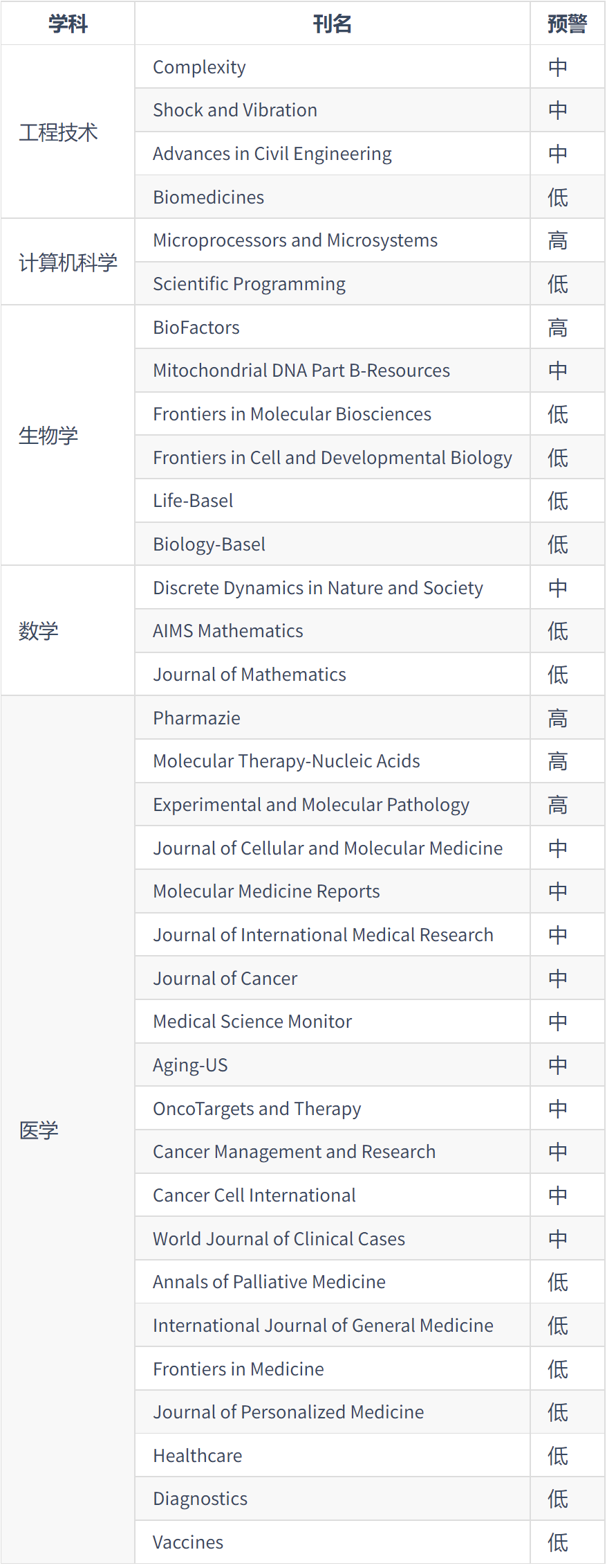 中科院预警期刊名单
