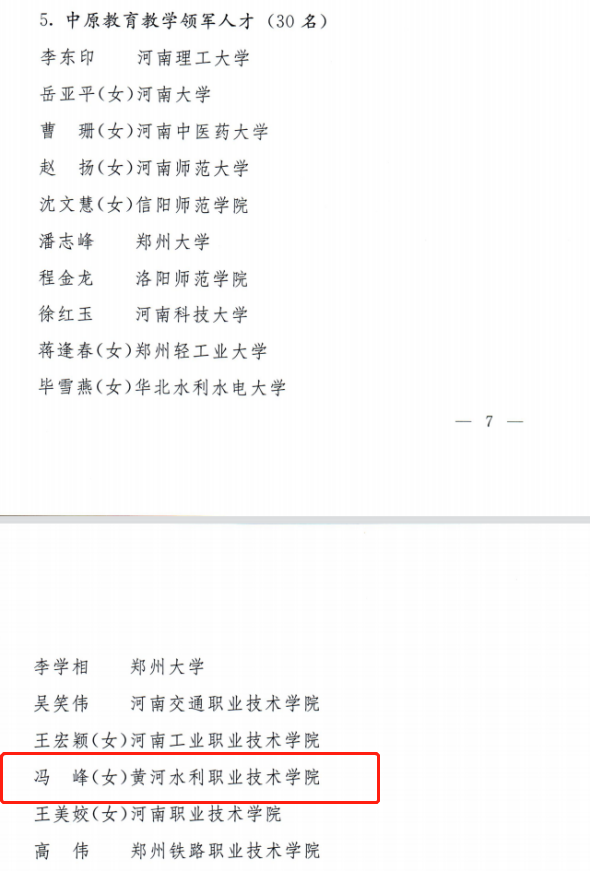 “中原英才计划”是河南省委省政府于2017年开始实施的高层次人才特殊支持计划,是围绕建设人才强省的战略部署,包括中原学者、中原领军人才、中原青年拔尖人才三个层次共10类人才。计划用5至10年时间,有重点地遴选支持2000名左右“中原学者”“中原领军人才”和“中原青年拔尖人才”等高层次人才,打造中原人才系列品牌。2022年8月,我校正式启动“中原英才计划(育才系列)”推荐报名工作,学校党委高度重视,教师工作部开展了动员报名、部门推荐、资格审查、专家评选、材料上报等工作环节,最终环境工程学院冯峰教授成功入选2022年度“中原英才计划(育才系列)”—中原教育教学领军人才人员名单。据悉,此次中原教育教学领军人才全省共入选30人,其中高职院校5人入选。