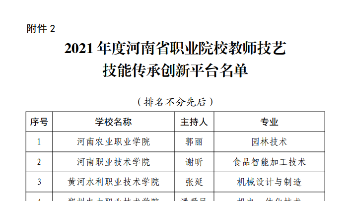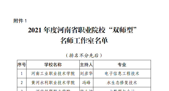 近日,河南省教育厅办公室发布《河南省教育厅办公室关于公布2021年度河南省职业院校“双师型”名师工作室和教师技艺技能传承创新平台名单的通知》(教办职成〔2022〕170号),我校冯峰教授主持的“水生态修复技术”获评河南省职业院校“双师型”名师工作室,张延教授主持的“机械设计与制造”获评河南省职业院校教师技艺技能传承创新平台。至此,我校已获评河南省职业院校“双师型”名师工作室和教师技艺技能传承创新平台各2个。