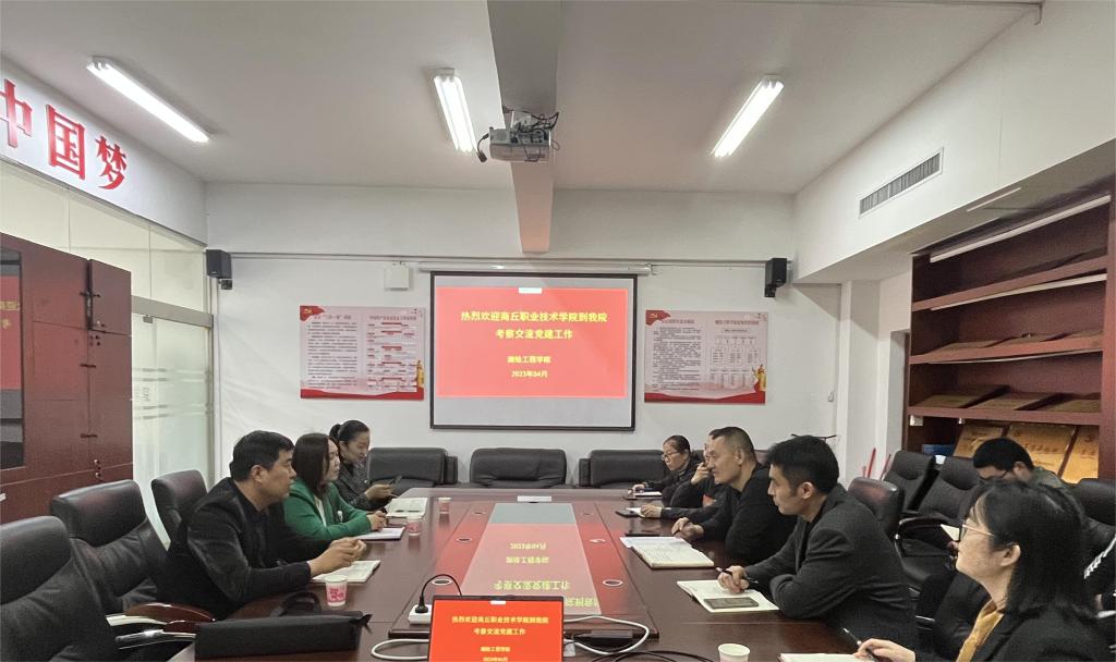 4月12日下午,商丘职业技术学院机电工程学院党总支书记陈英、师范学院党总支书记张瑞芳、交通学院党总支副书记刘帅一行在党委宣传部耿风副部长带领下到我院考察交流党建工作。测绘工程学院党总支副书记彭战松、第一学生支部书记李忠旺、教工支部书记孔令惠及各支委委员在学院党员会议室接待了来访客人。