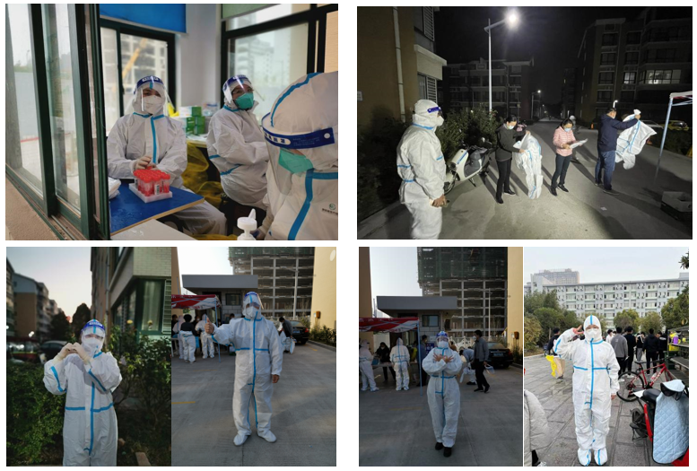 测绘工程学院的教师们更是摇身变成了“大白”志愿者,身着医护人员防护服,在校的给学生做核酸,在家属院的参与教师核酸检测志愿服务和单元楼道消杀,还有师生幕后工作者在微信群中积极传递最新动态、制作宣传语和宣传片。他们通力协作给广大师生提供物质保障和精神力量。