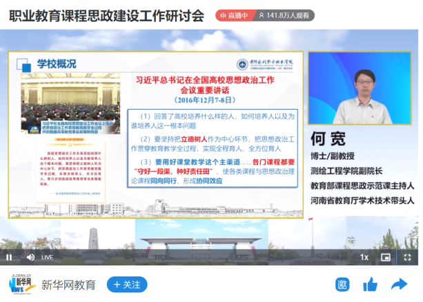 下午2:30,我院副院长、副教授、博士生、教育部课程思政示范课主持人、河南省教育厅学术技术带头人何宽,代表黄河水利职业技术学院进行了《GNSS定位测量》课程思政示范项目经验介绍。报告包括课程概况、教学团队建设、资源建设及推广应用等。