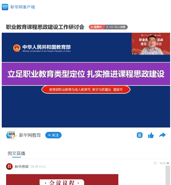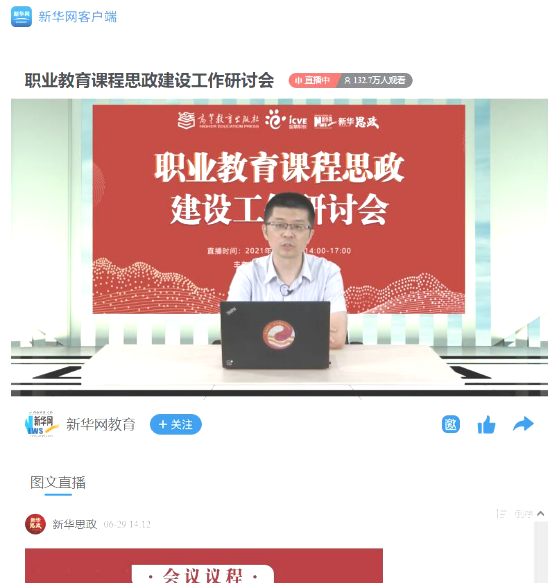 此次研讨会由高等教育出版社和新华网主办,高等教育出版社、新华网和教育部职成司教学处相关领导出席了研讨会。参会人员包括各职业院校相关领导、课程思政牵头部门主要负责人、课程思政教研中心负责人,二级院系主要负责人、各相关骨干教师等。