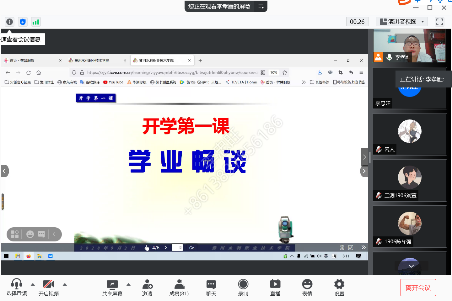 9月6日是我校在校生新学期上课第一天,按照近期疫情防控要求,所有课程均为线上授课。为保障落实正常的教学秩序,我院教工支部配合学院期初工作安排,联合学生支部,由党政班子全体党员和支委委员组成新学期教学督查组,检查组分小组深入腾讯会议线上课堂对所有课程进行全覆盖全方位检查,重点对疫情常态化防控教育是否到位、教师资料准备、课堂教学、学生到课以及教学资源保障与教学环境等方面进行了全面检查。