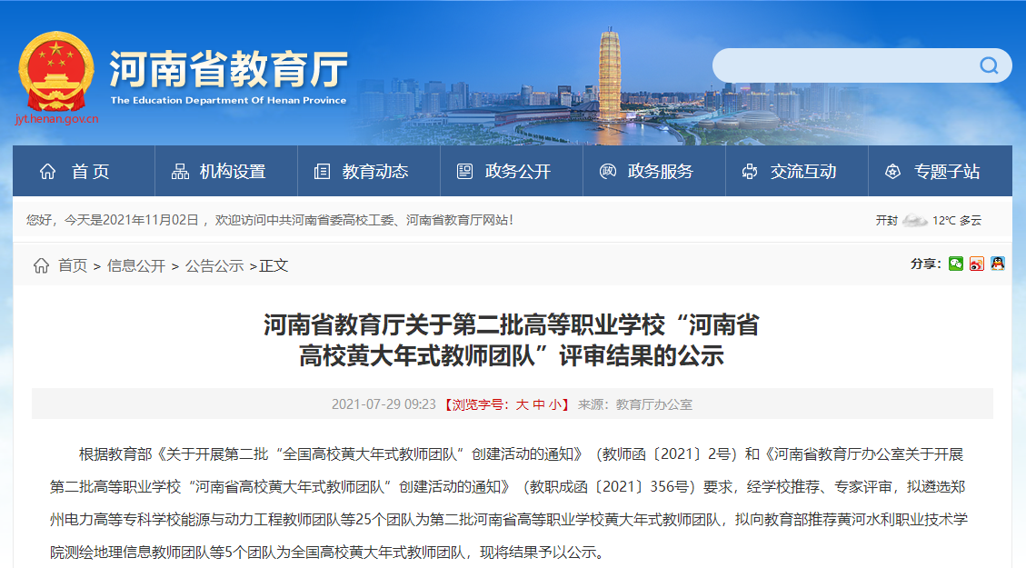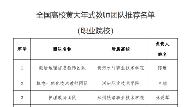 近日,河南省教育厅公布了第二批高等职业学校“河南省高校黄大年式教师团队”遴选通过名单。其中,陈琳教授负责的“测绘地理信息教师团队”荣获“河南省高校黄大年式教师团队”,并向教育部推荐为全国高校黄大年式教师团队。
