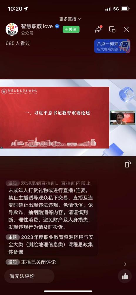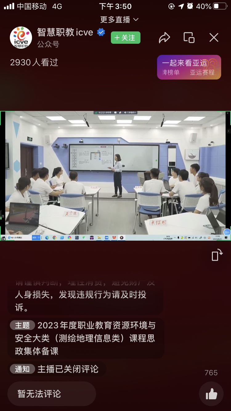 2023925日,测绘工程学院全体教师参加了智慧职教平台线上举办的2023年度课程思政资源环境与安全大类(测绘地理信息类)集体备课活动,国家级课程思政示范课程《GNSS定位测量》团队负责人何宽及团队成员陈琳、陈慧,代表黄河水利职业技术学院进行了课程说课和课堂教学展示,其余教师也参加了线上学习。