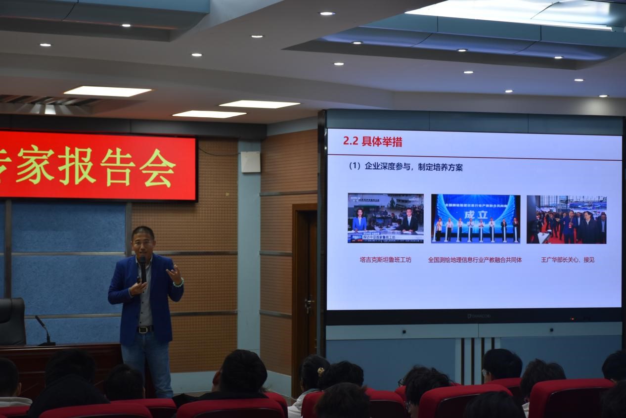 郭宝宇以《校企协同产教融合,提升人才培养质量》为题,从基本情况、主要举措、建设成效和未来设想四个方面进行了深入阐释, 并结合自己从学生时代到工作多年来的体验,表达了自己对测绘行业的情怀以及对产教融合和多行业应用的设想。报告立足实际、见解独到、深入浅出、具有很强的指导性和感染力。