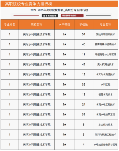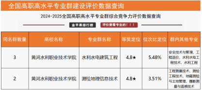 “国家级高水平专业群综合竞争力评价”数据显示,我校水利水电建筑工程专业群、测绘地理信息专业群2个高水平专业群上榜入围,在同类专业群中位列全国第一;“高职院校分专业大类竞争力排行榜”数据显示,我校资源环境与安全大类、水利大类2个分专业大类均位列全国第一;“高职院校分专业类竞争力排行榜”数据显示,我校测绘地理信息类、水文水资源类、水利工程与管理类、水土保持与水环境类4个专业类均位列全国第一;“高职院校专业竞争力排行榜”数据显示,我校14个专业上榜,其中测绘地理信息技术、摄影测量与遥感技术、地籍测绘与土地管理、无人机测绘技术、水文与水资源技术、水利工程、智慧水利技术、水利水电工程技术、水利水电建筑工程、水土保持技术、水电站设备安装与管理、治河与航道工程技术12个专业位列全国第一,测绘工程技术、水生态修复技术2个专业位列全国第二,土木工程检测技术、环境检测技术2个专业位列全国第三。