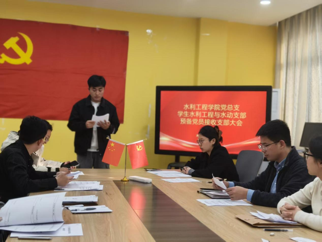 2025年11月28日中共黄河水利职业技术大学水利工程学院党总支学生水利工程与水动党支部在SY3414召开接收预备党员支部大会,支部全体党员、入党积极分子代表参会,会议由支部书记祁航主持。