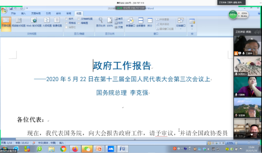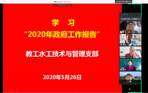2020年05月26日下午3:00,水利工程学院教工水工技术与管理党支部全体党员通过腾讯会议直播的形式在线学习李克强总理在两会上的政府工作报告,活动由教工水工技术与管理党支部书记王建伟主持,支部全体党员参加。