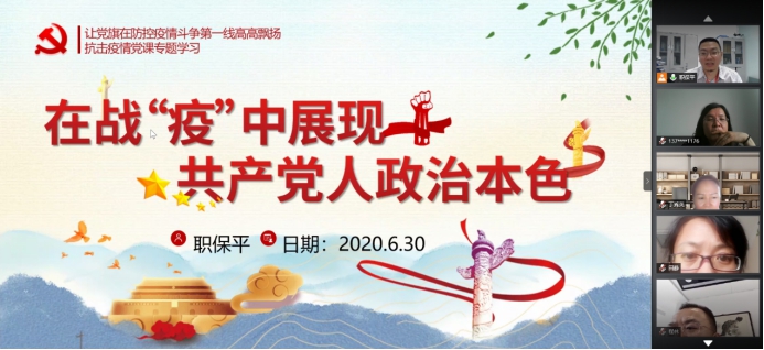 2020年6月30日,教工水利工程与水动党支部通过腾讯会议方式开展“抗击疫情党课专题学习”活动,党支部书记职保平同志为全体支部党员讲授题为“在战疫中展现共产党人政治本色”专题党课,支部11名同志参加。