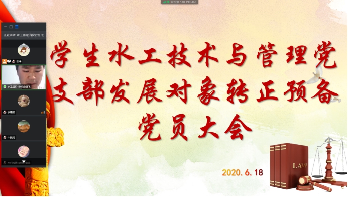 6月18日晚七点,水利工程学院学生水工技术与管理党支部以腾讯会议的形式召开了发展对象转预备党员大会。本次会议由许晓瑞书记组织主持召开,学生党支部全体党员及13名发展对象参会。