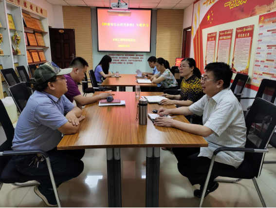 2020年7月6日,水利工程学院党总支开展《河南省社会信用条例》专题学习。会议由水利工程学院党总支书记孙天星主持。