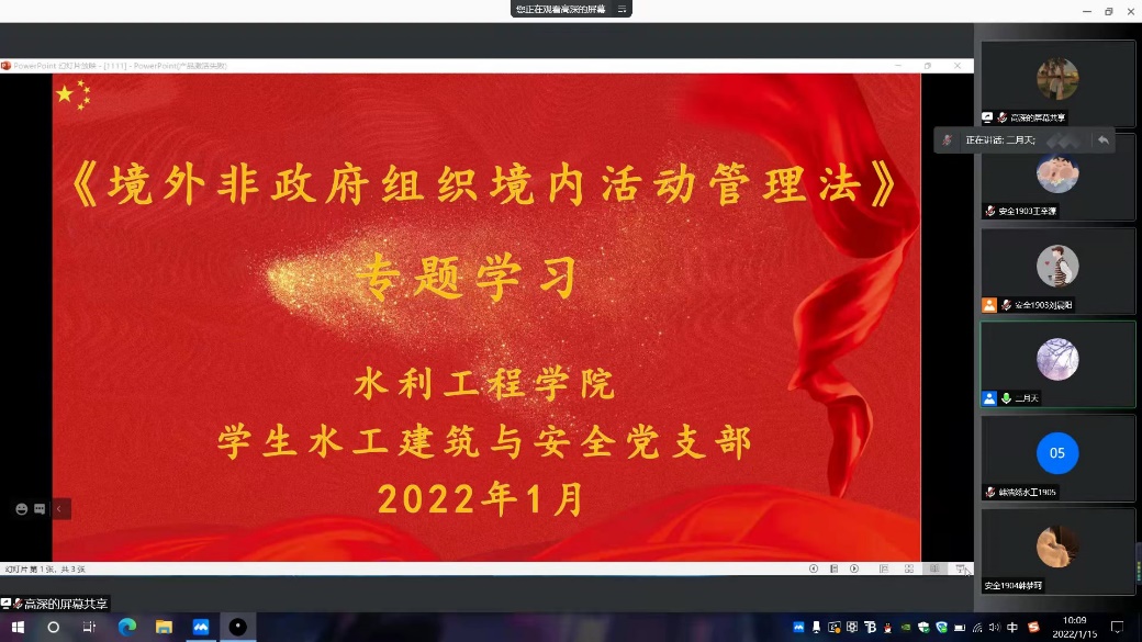 为进一步加强普法宣传,增强师生法律意识,强化师生安全防范能力,1月15日,水利工程学院开展了《中华人民共和国境外非政府组织境内活动管理法》实施五周年普法宣传活动,本次活动通过总支专题学习、师生党支部专题研讨、网络宣传等进行多形式、全方面开展。