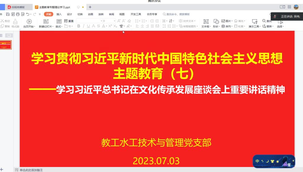 7月3日晚上,教工水工技术与管理支部全体党员通过腾讯会议形式开展学习贯彻习近平新时代中国特色社会主义思想主题教育专题学习,主要内容为《学习习近平总书记在文化传承发展座谈会上重要讲话精神》,专题学习由支部副书记吴伟同志主持。