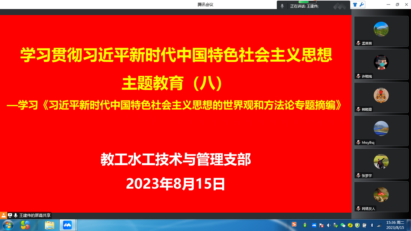 8月15日下午,教工水工技术与管理支部全体党员通过腾讯会议形式开展学习贯彻习近平新时代中国特色社会主义思想主题教育专题学习,主要内容为《习近平新时代中国特色社会主义思想的世界观和方法论专题摘编》,专题学习由支部书记王建伟同志主持。