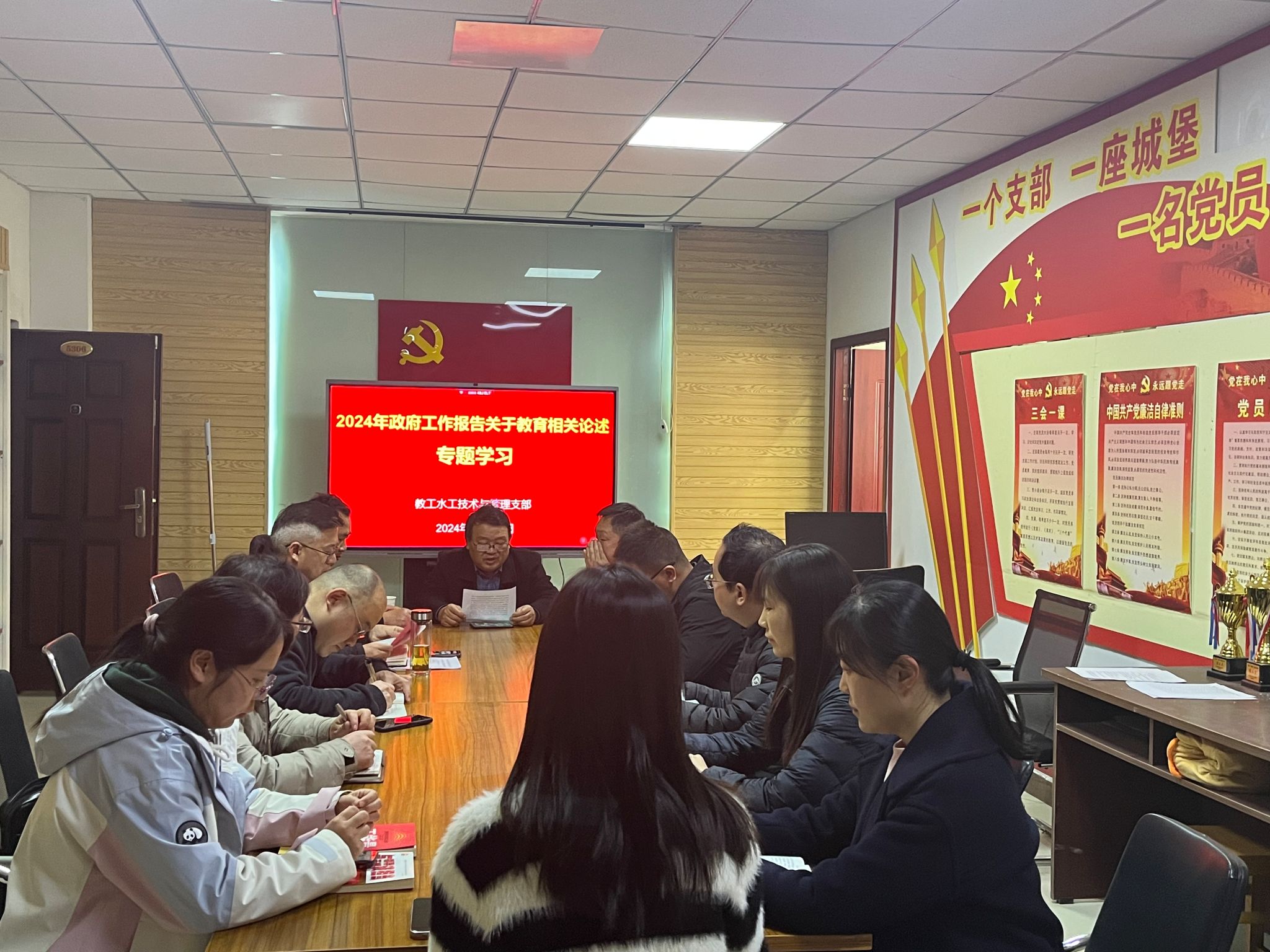 3月12日,教工水工技术与管理党支部在会议室(SY5306)召开集体学习会议,专题学习2024年政府工作报告中关于教育论述的内容,会议由支部书记王建伟同志主持,支部全体党员参加学习。