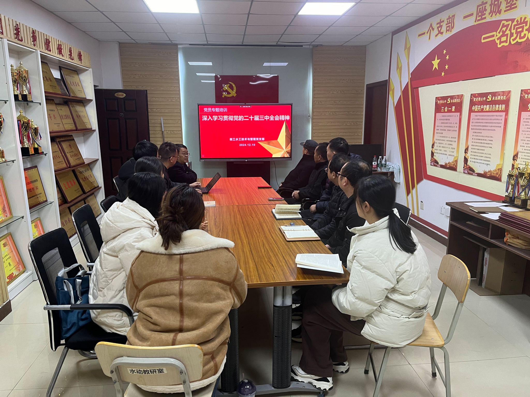 1210日,教工水工技术与管理党支部全体党员在实训楼5306专题学习党的二十届三中全会精神,支部全体党员参加了本次学习
