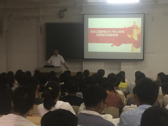 为进一步落实十八届六中全会精神,引导广大入党积极分子、学生党员认真学习中国共产党章程,顺利开展党的基本知识竞赛活动,2017年5月19日下午4点,水利工程学院在jx2102召开了关于开展“喜迎十九大永远跟党走”党的基本知识竞赛动员会,出席本次考前动员的有:党总支书记叶建海、党总支办公室主任李晓娟以及水利工程学院全体辅导员们。