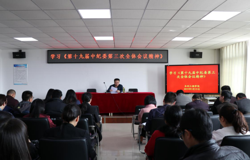 孙天星介绍了十九届中纪委三次全会主要内容、大会取得的重要成果,重点带领大家学习了习近平总书记重要讲话精神。他说,习近平总书记的讲话站在新时代党和国家事业发展全局的高度,充分肯定党的十九大以来全面从严治党取得新的重大成果,深刻总结改革开放40年来党进行自我革命、永葆先进性和纯洁性的宝贵经验,对领导干部和全体党员同志提出明确要求,强调坚定不移推进全面从严治党,巩固发展反腐败斗争压倒性胜利,为决胜全面建成小康社会提供坚强保障。之后,孙天星领学了《十届省纪委四次全会精神》并结合学院近期工作重点作进一步要求。