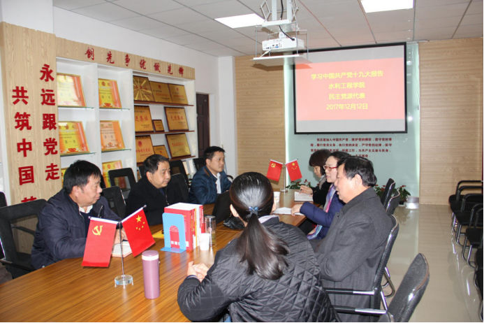 12月12日,黄河水利职业技术学院水利工程学院领导班子与学院民主党派教师代表一起学习党的十九大报告,领会十九大关于统一战线的精神。书记叶建海、副书记楚万强、院长罗全胜、副院长陈诚、九三学社黄河水院支社主委张圣敏、社员陶杰、积极分子李梅华、王智阳等参加了学习座谈会。