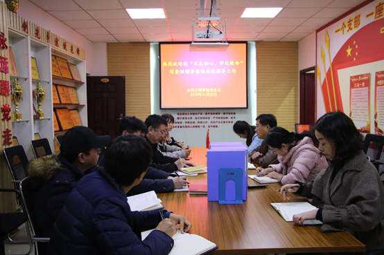 水利工程学院党总支书记孙天星简要介绍了学院“不忘初心、牢记使命”主题教育开展情况和特色做法,并就学院“五个一”、“以案促改”、大学生廉洁教育等工作开展情况作重点介绍。王忠伟对我院“不忘初心、牢记使命”主题教育工作开展情况给与高度评价,希望我院提高政治站位、狠抓调查研究和整改落实,继续将“不忘初心、牢记使命”主题教育工作做好做实。