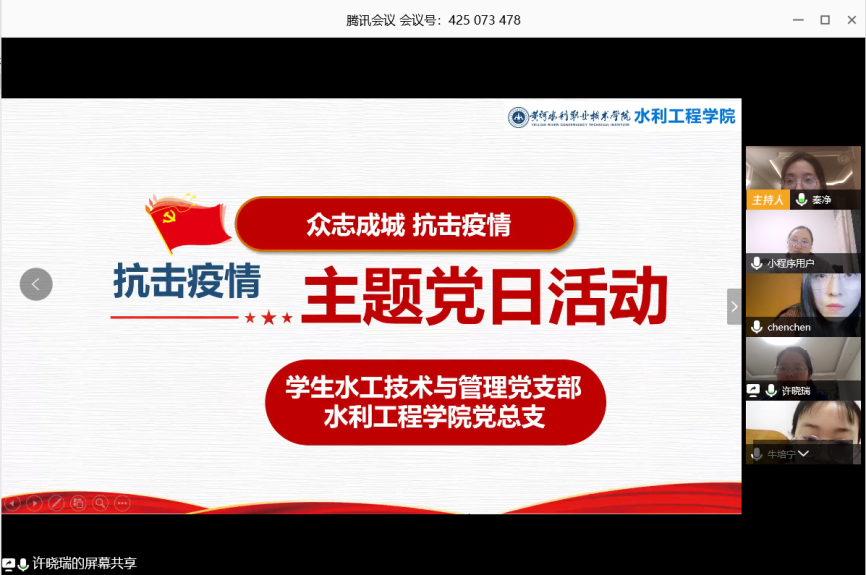 为发挥基层党支部战斗堡垒作用,响应河南省“把灾难当教材,与祖国共成长”主题教育,2020年3月27日,水利工程学院学生水工技术与管理党支部全体党员通过腾讯会议的形式在线开展“抗击疫情”主题党日活动,活动由支部书记许晓瑞主持。